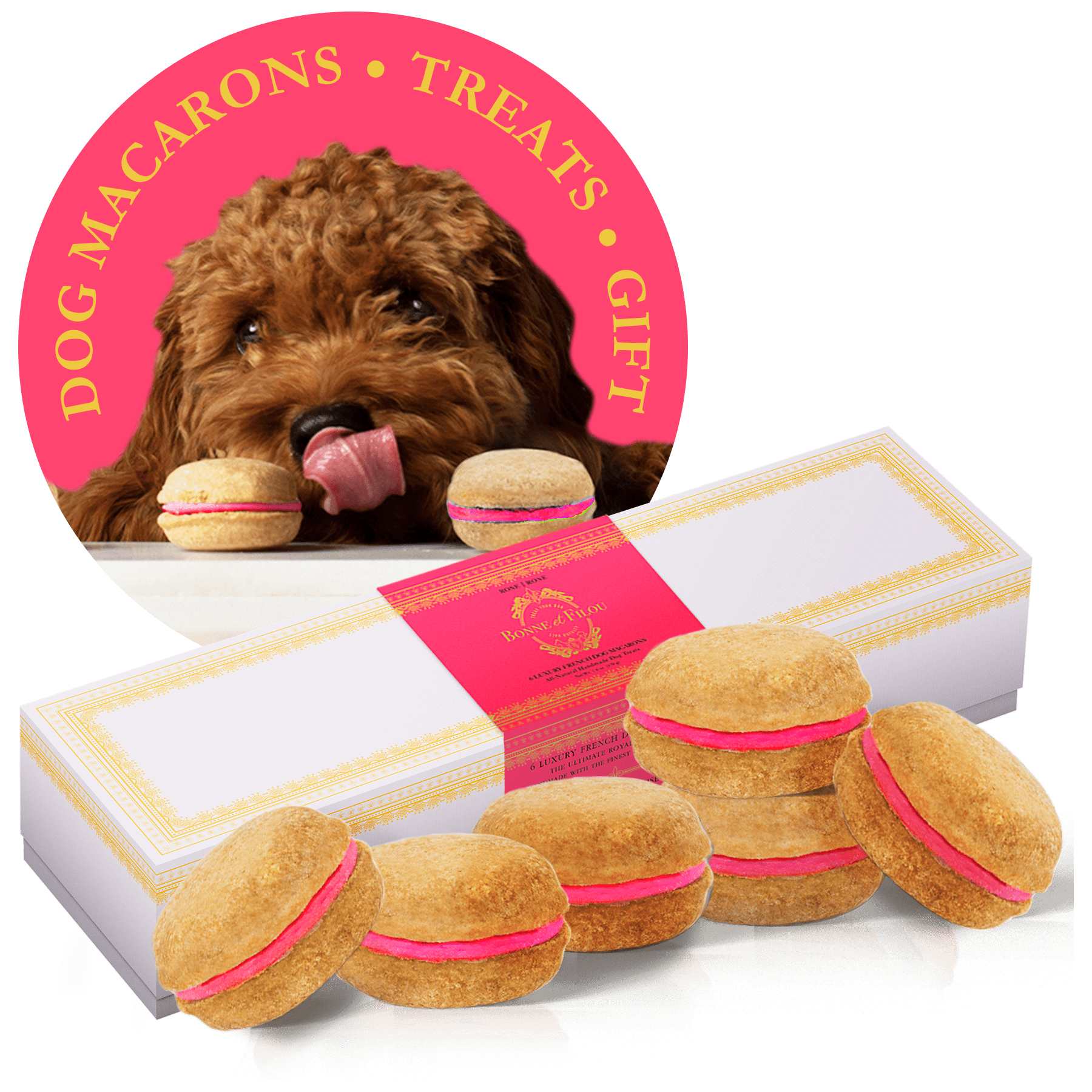 Dog Macarons - Count of 6 (Dog Treats | Dog Gifts)This box of our premium macaron treats features: - Box of 6 dog macarons- Handmade with premium human-grade ingredients in the USA- 100% natural; corn-free; wheat-free ingredients- No artificial coloring or preservatives- Hard treat designed for a long-lasting chew- Shelf life of 12+ months | No need for refrigerationBase Recipe Ingredients: Oat Flour; Honey; Coconut Oil; All-Natural Flavored Yogurt FillingFeeding Instructions:Our treats are hard; designed for a long-lasting chew. For elderly or small dogs; we recommend breaking the treat in smaller pieces (by twisting both sides).