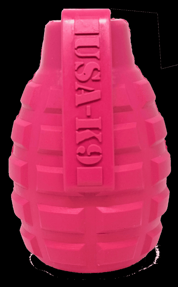 DISPENSES TREATS: Help your dog fight boredom by filling the Grenade Toy with treats like kibble, canned dog food, peanut butter, or your favorite dog treat recipe. Best results: mix wet/dry foods. Freeze with treats inside to prolong use.REDUCES PROBLEM BEHAVIORS: Reduces problem chewing, helps reduce boredom, and relieves separation anxiety.MADE IN USA: Proudly keeping jobs in America! Designed and manufactured in the USA!ANIMAL and PLANET FRIENDLY: Material is FDA compliant, non-toxic and biodegradable. It is sustainably harvested helping us reduce our carbon footprint.